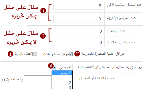 - توجد نوعان من الحقول: (رقم1) حقل محاط بمربع وهذا قابل للتحرير و يسمح بكتابة النصوص ، وحقل آخر (رقم2) غير قابل للتحرير ، وإنما يعبأ الحقل تلقائيا من حقول أخرى