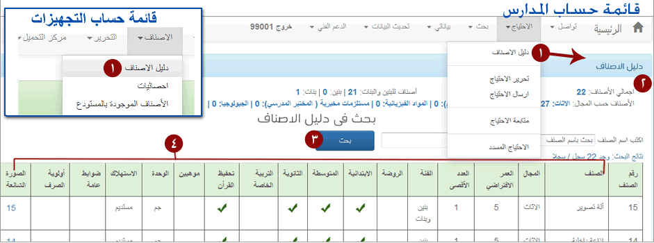 من قائمة الاحتياج اختر دليل الاصناف (رقم1) ستظهر لك صفحة دليل الاصناف (رقم2).