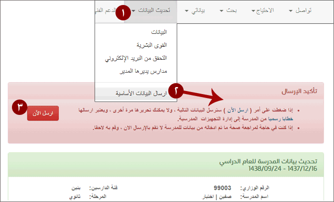عندما تنتهي من إدخال بيانات المدرسة وتحديثها ، والقوى البشرية قم بإرسالها إلى إدارة التجهيزات المدرسية عبر قائمة تحديث البيانات (رقم1) ثم قائمة ارسال البيانات الأساسية (رقم2) ، ثم ستظهر جميع البيانات ، إذا كنت متأكدا من صحتها ولا تحتاج إلى تعديل قم بالضغط على أمر ارسال الآن (رقم3).