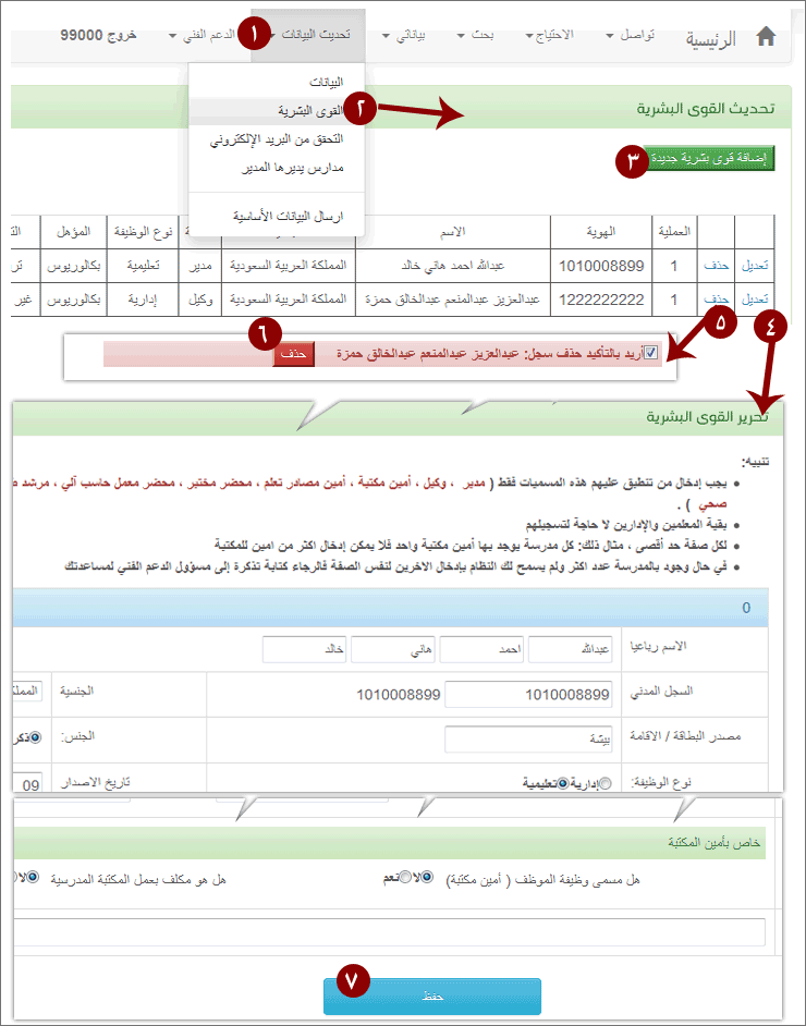 لحذف سجل أحد الموظفين أو المعلمين اضغط أمر حذف (رقم6)، قم بالنقر على تأكيد الحذف ثم اضغط على أمر حذف (رقم6).
