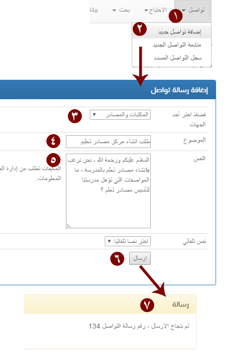 من القائمة اختر تواصل ثم إضافة تواصل جديد ثم اتبع الخطوات التالية كما في الصورة: