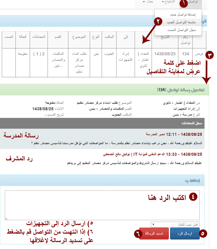 تتيح لك هذه الخدمة في الإجابة على الأسئلة والاستفسارات التي تحتاجها المدرسة ، حيث ستجد الإجابة والرد على استفساراتكم وأسئلتكم خلال أوقات الدوام الرسمي